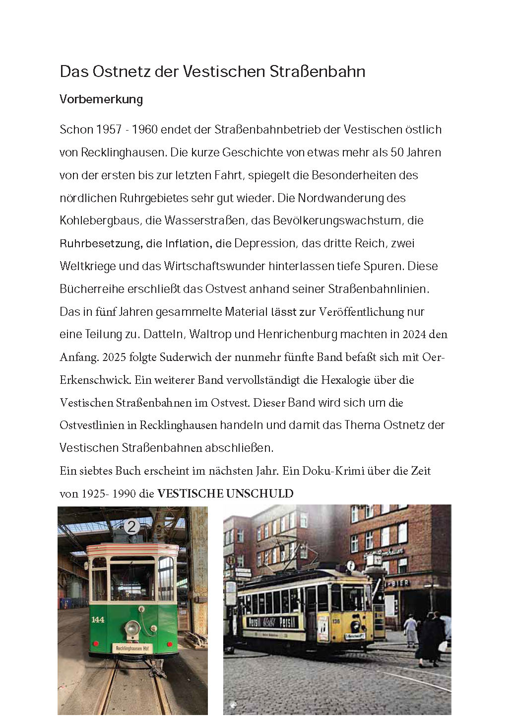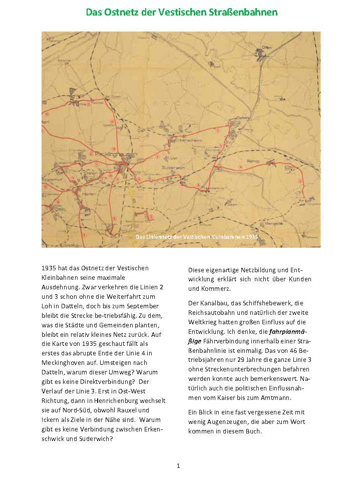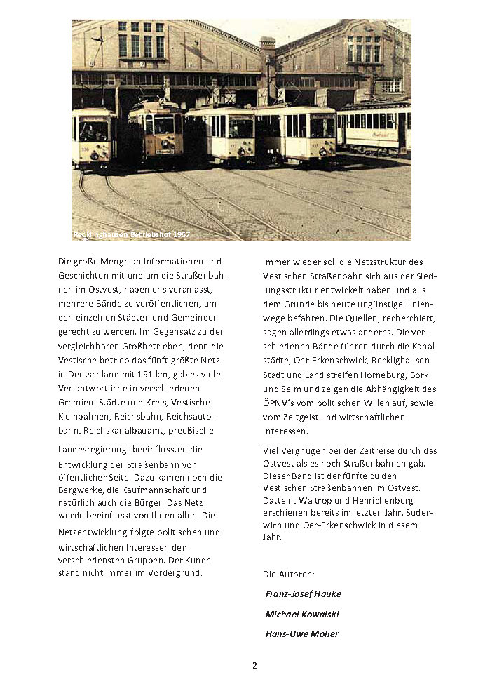 In diesem Jahr am 29.05. vor 65 Jahren fuhr zum letzten Mal eine Straßenbahn durch Oer-Erkenschwick. Die Stadt ohne Bahnhof war damit gleislos im Personenverkehr. 51 Jahre verkehrten Straßenbahnwagen zwischen Recklinghausen und Erkenschwick. Das hatte man sich anders gedacht. Auf 120 Seiten, mit über 120 Fotos und Abbildungen berichten die Autoren über die großen Pläne von Oer- Erkenschwick und einen Blick in die Zukunft.
